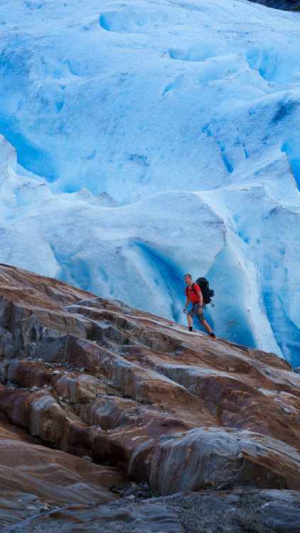 We were so eager to begin exploring the glacier that we nearly jogged up the steep, polished rock. At the top, the long glacier awaited, pressing its way down the mountainside. The warm tones of the rock stood in stark contrast to the cold colors of the ice.